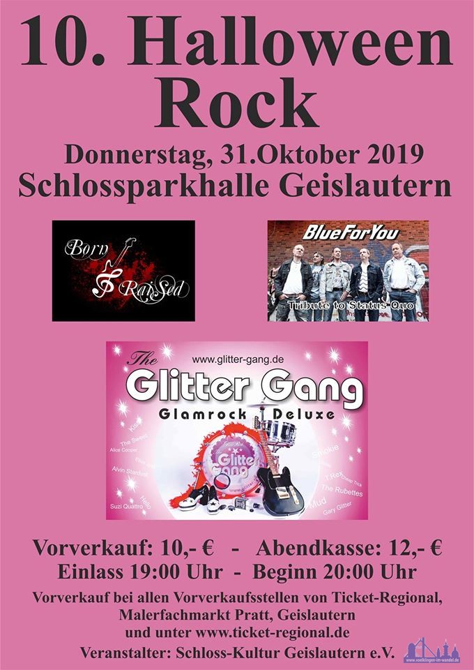 Danach wird die „Glitter Gang“ die Schlossparkhalle rocken. “The Boys are back in Town” heißt der Slogan mit dem die Glitter Gang wieder in bekannten Gefilden unterwegs ist! Bis 2009 waren die Glam-Rocker sehr erfolgreich im Saarland auf Tour.