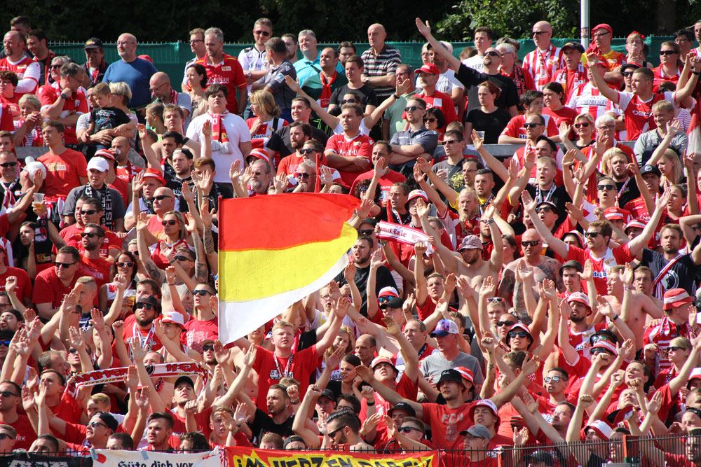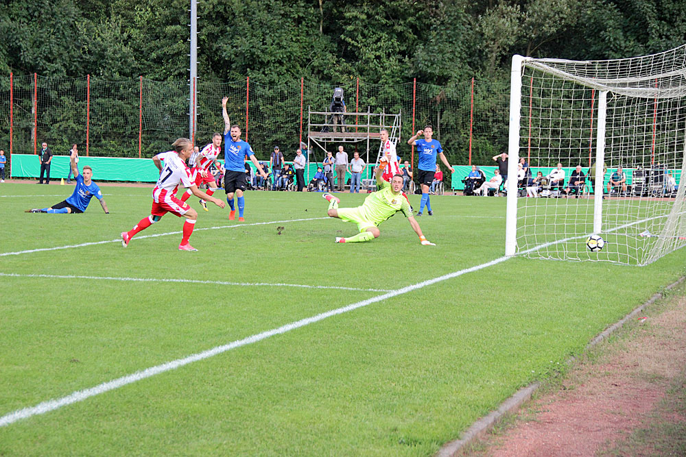 Vom Anpfiff weg merkte man den Blau-Schwarzen an, wie heiß sie auf eine Sensation waren. Zwar merkte man zu Beginn den Respekt vorm Zweitligisten, doch die ersten guten Aktionen kamen: Schmidt wurde zweimal wegen einer Abseitssituation zurück gepfiffen. Auf der Gegenseite musste Cymer nach einem Fehlpass retten. Die Gäste aus Berlin-Köpenick hatten zu Beginn viel Ballbesitz, die „Eisernen“ ließen die Kugel laufen und hatten nicht nur einmal Pech.