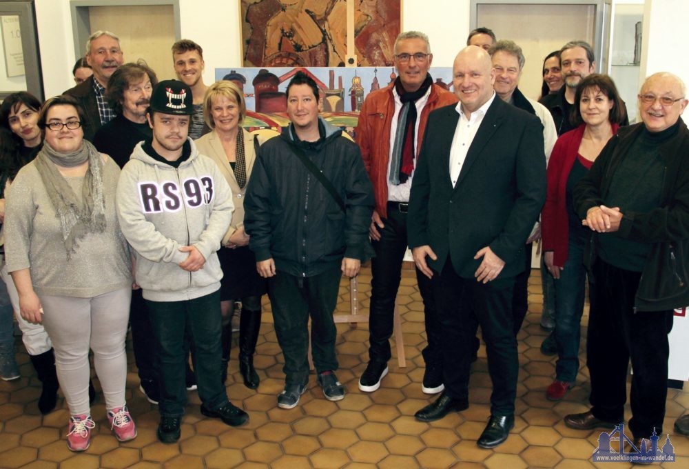 Die Ausstellung zeigt Gemeinschaftsarbeiten aus den Integrationskursen der Sprachoffensive Deutsch, die seit vielen Jahren gemeinsam mit Völklinger Künstlern und Dozentinnen und Dozenten der Sprachkurse gestaltet wurden. „Ein Exponat zeigt insbesondere, was Volkshochschule ist“, sagte VHS-Direktor Karl-Heinz Schäffner und zeigte auf ein Bild des Alten Rathauses. Bei näherem Hinsehen erkannte man, dass das Gesamtbild aus vielen einzelnen Portraits von Bürgern, Besuchern, Teilnehmenden und Dozenten zusammengesetzt war.