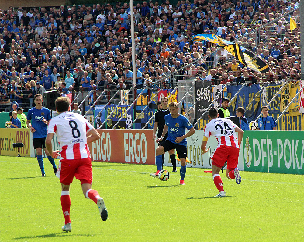 Das Hermann-Neuberger-Stadion wurde im Winter vor gut 1 1/2 Jahren mit einfachsten Mitteln auf Kosten des 1. FC Saarbrücken zu einem regionalligatauglichen Stadion ausgebaut, wovon heute der hier eigentlich beheimatete SV Röchling Völklingen profitiert. In diesem Jahr blieb die Bewährungsprobe aus: Der 1. FC Saarbrücken scheiterte in der ersten Pokalrunde, doch was kommt in den kommenden Spielzeiten? Für die Fans ein Traum, für die Verantwortlichen fast das Worst-Case-Szenario: Der 1. FC Kaiserslautern als „Lieblingsgegner“ oder einer der großen Bundesligisten wird dem FCS zugelost – ob das Hermann-Neuberger-Stadion dann noch reicht? Fraglich! Die ca 6.400 Plätze im Völklinger Stadion jedenfalls nicht.