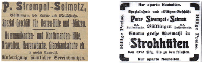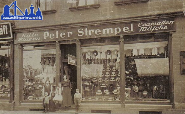 Margarethe und Peter Strempel eröffnen am 01. April 1908 in Völklingen, Ecke Moltke- und Luisenstraße (der heutigen Karl Janssen Straße) im Hause Wagner eine Filiale von Saarlouis aus ebenfalls ein Spezial- Hut- und Mützengeschäft.