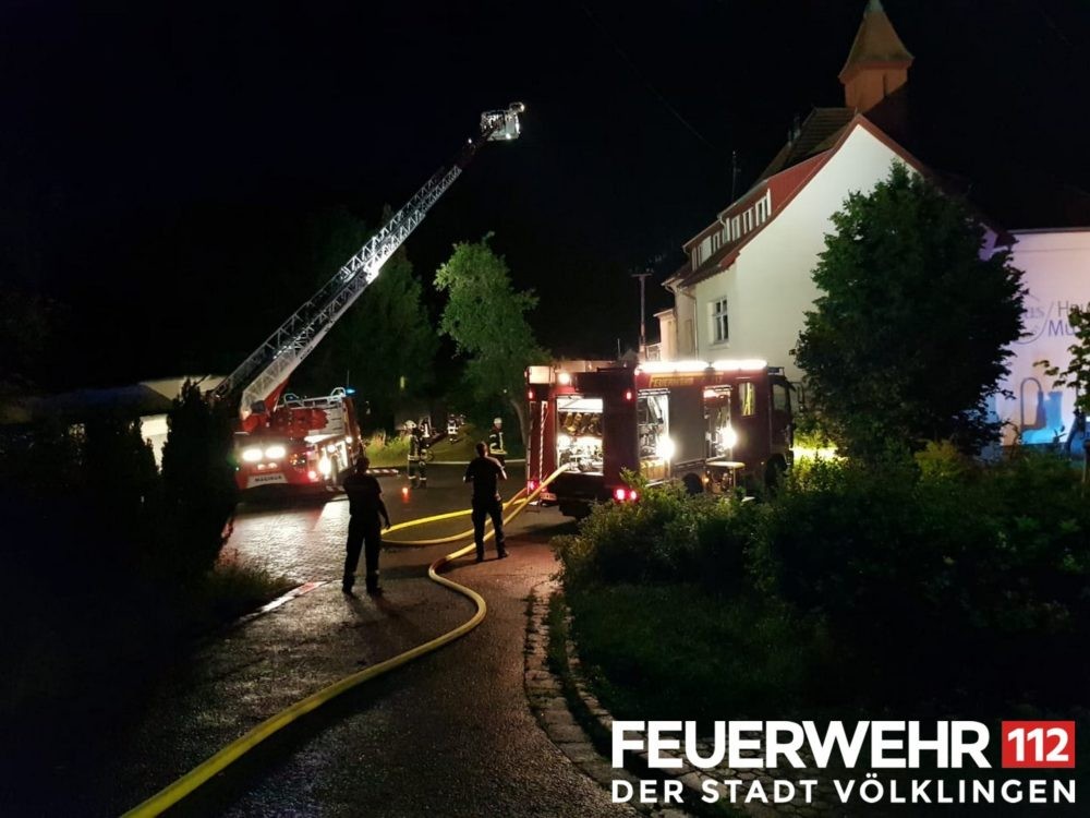 #Völklingen-#Ludweiler. Mit einem Großaufgebot rückten am Donnerstagabend -31.05.2018- die Freiwilligen Feuerwehren der Löschbezirke Mitte, Ludweiler, Lauterbach und Geislautern  aus, um einen Dachstuhlbrand, der in einem dreigeschossigen Anwesen in der Straße Am Bürgermeisteramt ausgebrochen war, zu bekämpfen. Dort stellte sich heraus, dass mehrere auf dem Dachboden aufgestellte Baustrahler nicht ausgeschaltet wurden und sich dadurch mehrere Sperrholzplatten entzündete. Der Dachboden brannte aus. Durch den Brand wurde auch der Dachgiebel des Nachbargebäudes, in dem das Heimatmuseum untergebracht ist, in Mitleidenschaft gezogen. Das Brandobjekt ist bis auf weiteres unbewohnbar.