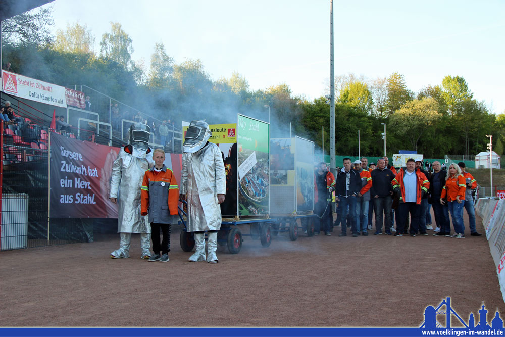 In der Halbzeit ziehen die Stahlarbeiter los und stellten bildlich dar, was sie zuvor erklärten: Eine Fußgruppe zieht zwei Wagen über die Laufbahn des Hermann-Neuberger-Stadions. Der erste zeigt das Blasstahlwerk Völklingen, nichts kommt heraus…. dahinter der zweite Wagen, er symbolisiert die dreckigen Schlote der chinesischen Stahlindustrie und qualmt wie die Völklinger Hütte in den 40er und 50er Jahren, als man auf der ganzen Welt noch nicht viel vom Umweltschutz verstand.