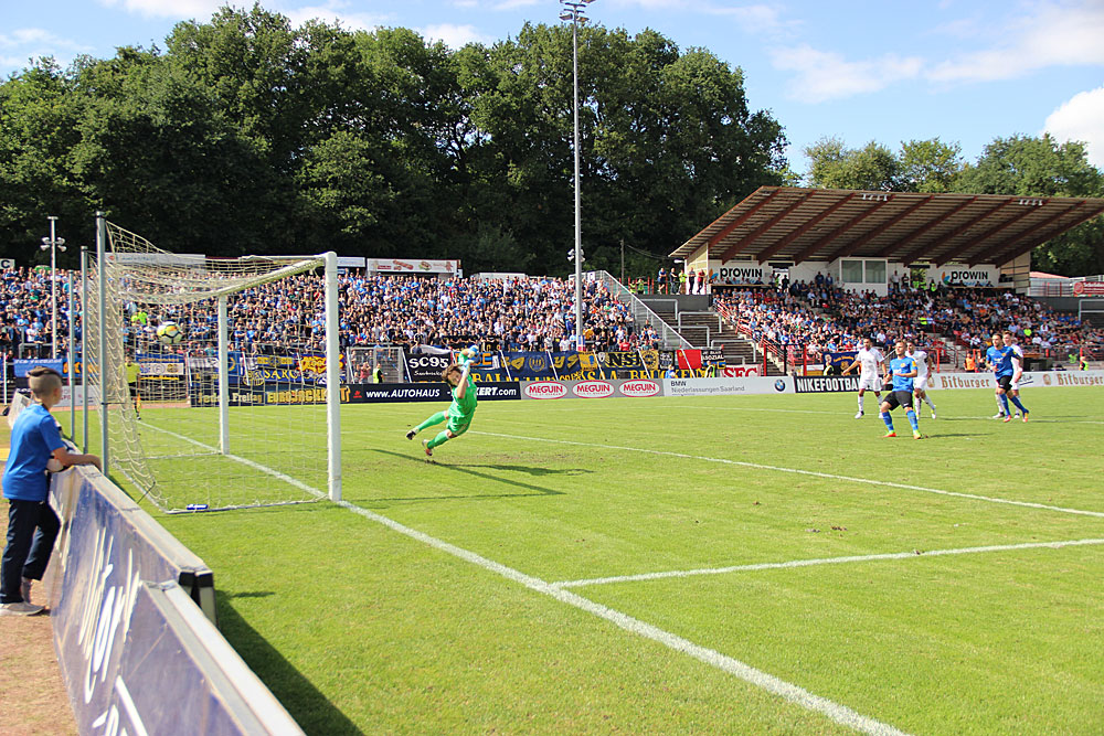 Doch Völklingen machte es dem 1. FC Saarbrücken dann doch nicht so einfach! So hatte Nico Zimmermann aus 18 Metern die Führung auf dem Fuß, doch der Kasten war nicht ganz groß genug. Nicht lange dauerte es bis die Blauschwarzen dann die Führung feierten: Müller flankt in die Mitte vor Röchlings Schlussmann Jean Francois Kornetzky auf Martin Dausch, der versenkte per Kopf zum 1:0 in der 28. Minute – Kornetzky chancenlos!