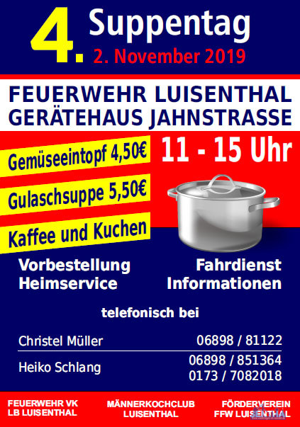 #Luisenthal. Der Löschbezirk III Luisenthal der Feuerwehr Völklingen veranstaltet in diesem Jahr bereits den 4. Suppentag. Gemeinsam mit Köchen aus Luisenthal und dem Förderverein der Feuerwehr Luisenthal werden am Samstag, den 02.11.2019 im Gerätehaus der Feuerwehr in der Jahnstraße 2, Suppen angeboten.