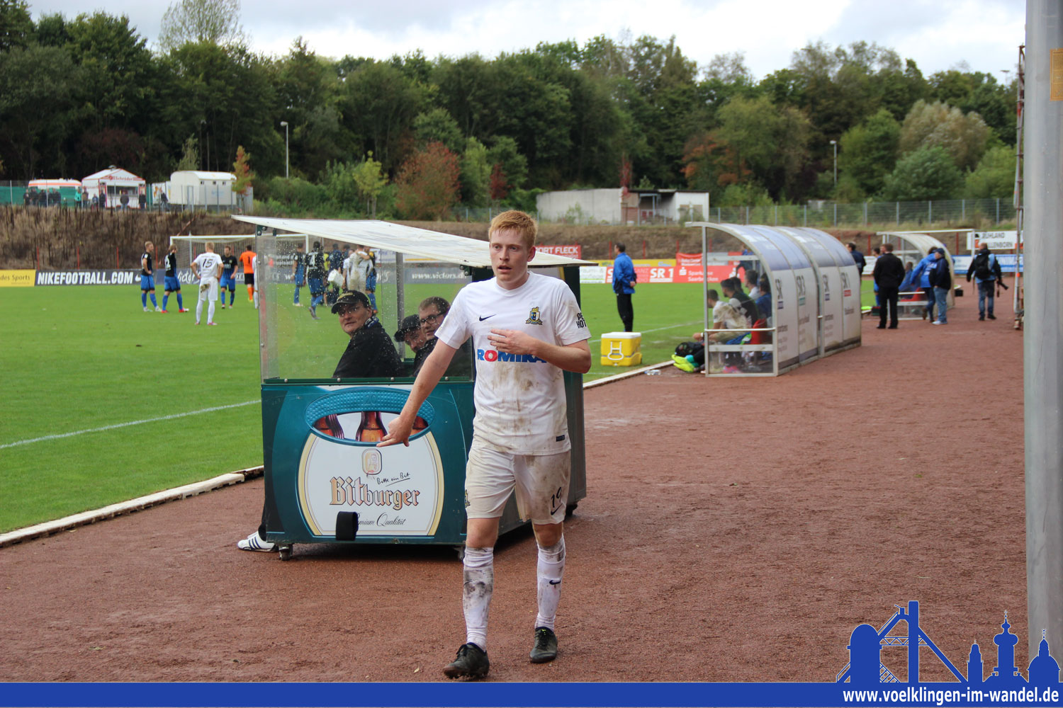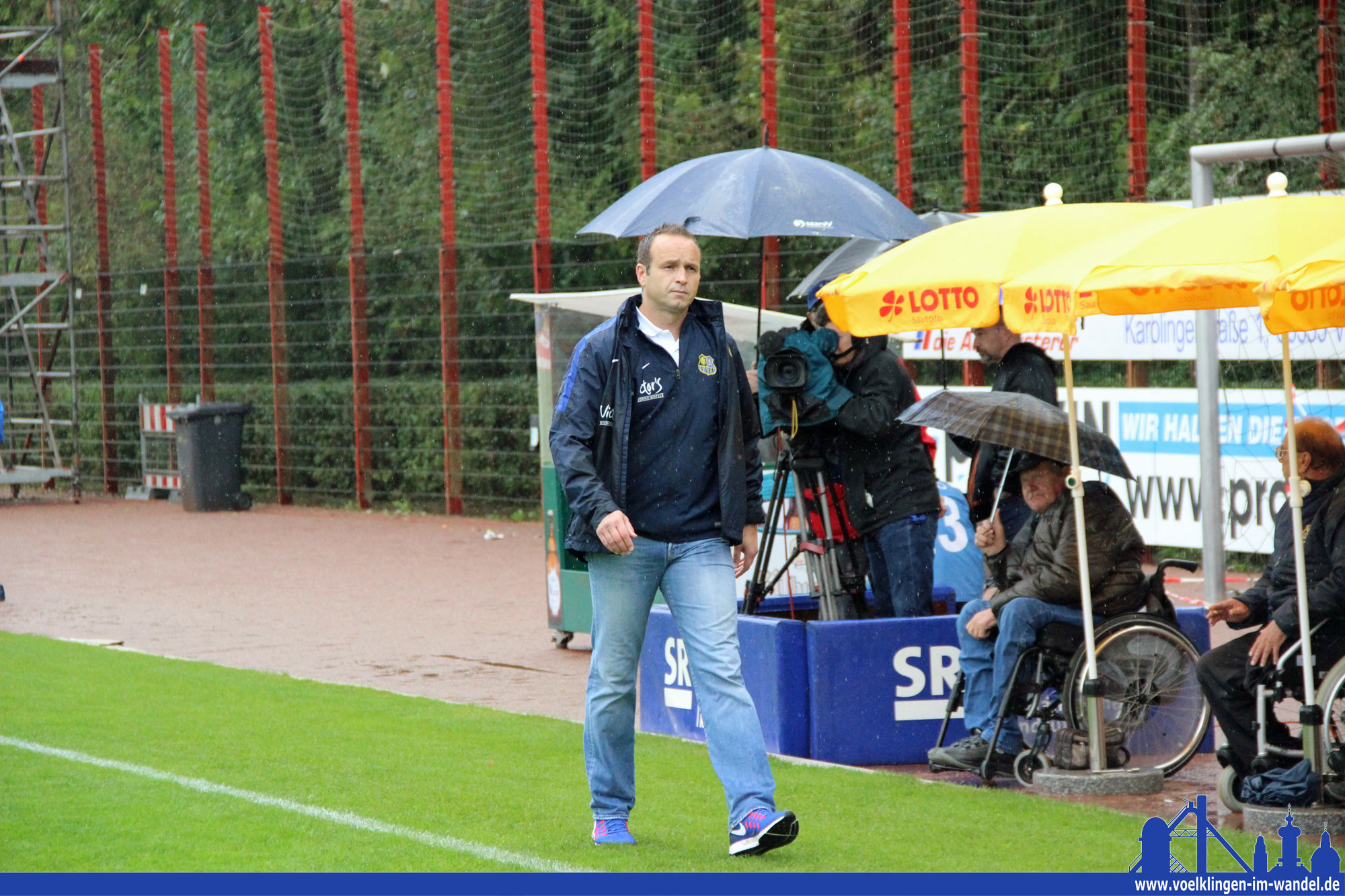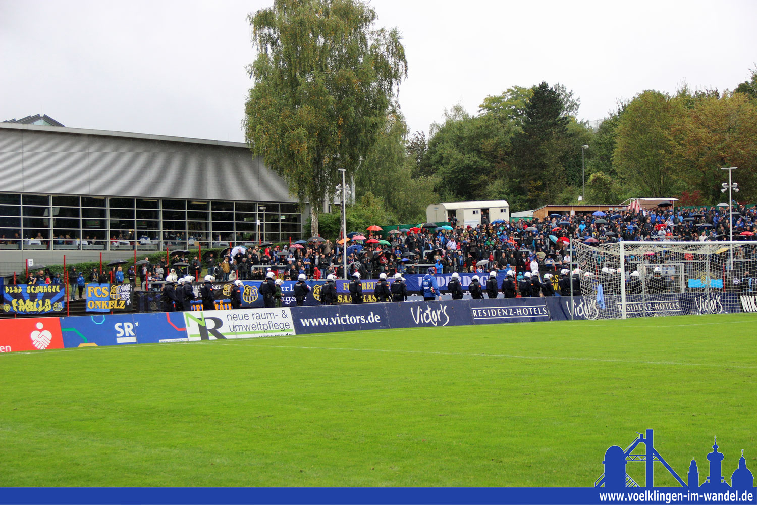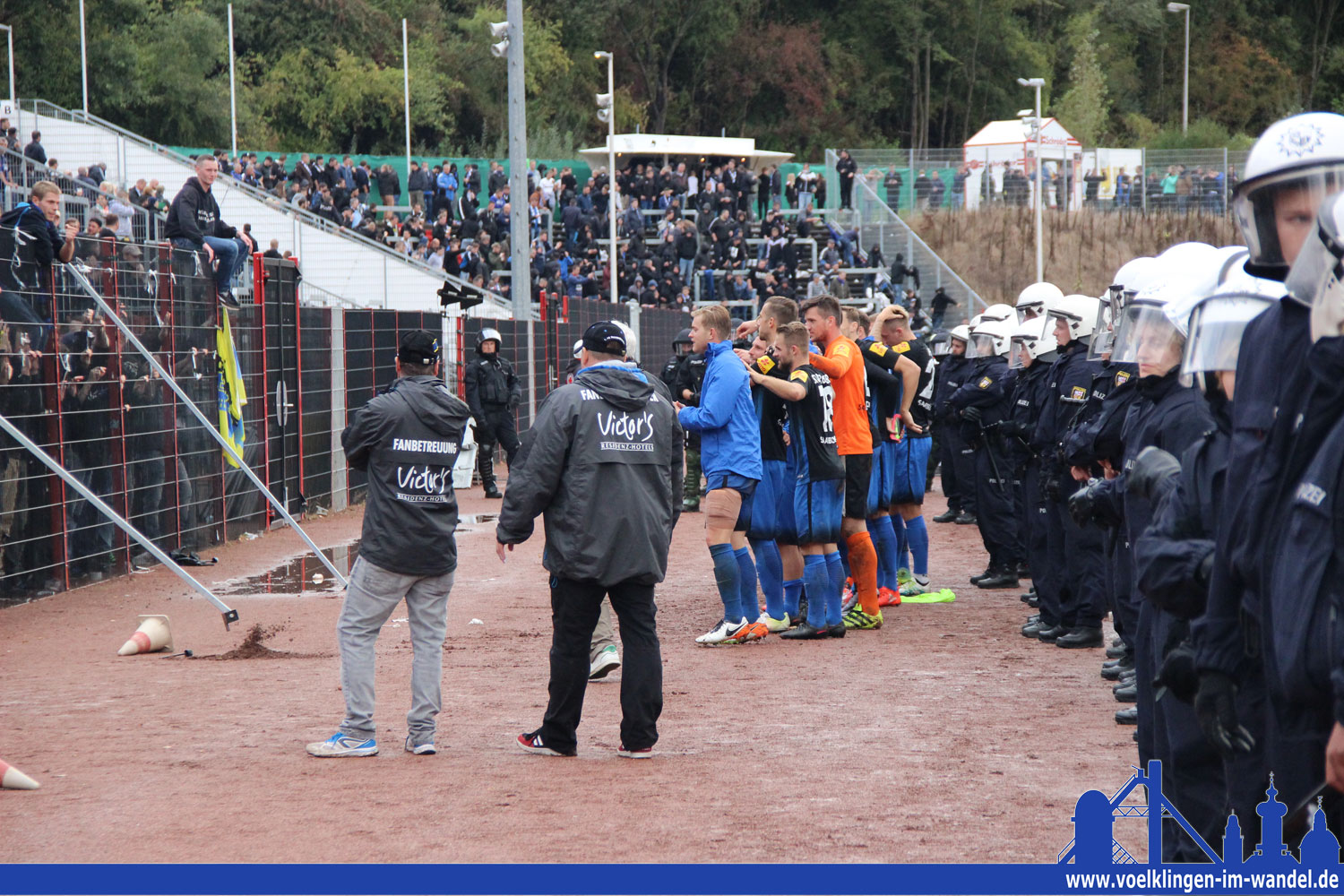 Plötzlich befinden sich Fans im Innenraum! Nachdem Zuschauer aus dem Trierer Fanblock den Innenraum betraten, reagierten die Saarbrücker und taten es ihnen gleich – so zu mindestens der Eindruck des Autors. Das Spiel ist unterbrochen, die Elf aus Trier verlässt begleitet von den Schiedsrichtern den Platz, während die Saarbrücker Spieler auf dem Feld warteten.