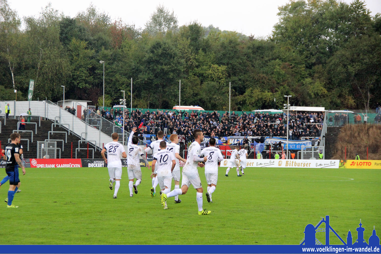 Zunächst beginnt das Spiel ausgeglichen, außer den üblichen Nettigkeiten rivalisierender Fangruppen gab es auch auf der Tribüne keine nennenswerten Ereignisse, doch ein Foul von Peter Chrappan an Sebastian Szimayer sollte das Spiel zum Kippen bringen: Elfmeter für die Eintracht aus Trier. Muhammed Alawie lässt sich nicht lange bitten, versenkt sicher zum 0:1 für die Gäste – auf den Rängen wird es laut: „Schieber! Schieber!“, schallt es aus der Saarbrücker Kurve, zu unrecht wie Patrick Schmidt nach dem Spiel erklärte es: „Drei mal das gleiche Foul am gleichen Spieler, es war klar dass der Schiri dann irgendwann mal Pfeifen wird.“ Die Fernsehbilder des SR sagen hier etwas anderes, offensichtlich eine schwere Entscheidung, die Gaetano Falcicchio treffen musste.