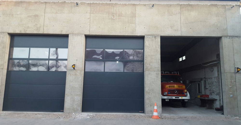 Die neue Fahrzeughalle wurde um 2,50 Meter in der Tiefe erweitert und um circa zwei Meter erhöht. Um dies zu ermöglichen, wurde die alte Flachdachkonstruktion und die vorhandene Hallenfront vollständig abgerissen. Auch die Bodenplatte mußte gänzlich entfernt werden. Die Bodenplatte wurde von der Firma Barth & Sohn komplett neu aus Beton gegossen. Die neu integrierte Fußbodenheizung wurde von der Firma Haustechnik Stefan Pilger installiert. Die neue Hallenfront bietet Platz für drei normgerechte Sektionaltore, welche die Firma Metallbau Patric Schmidt lieferte und montierte.