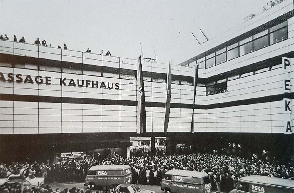 1967 standen bereits die Betonmischer in der 11,5 Meter tiefen Baugrube: Das Passagekaufhaus (PEKA) beginnt zu wachsen. Am 29. August 1968 wird das Kaufhaus eröffnet, bereits 1970 eröffnet PEKA das erste Völklinger Automobil-Parkhaus.