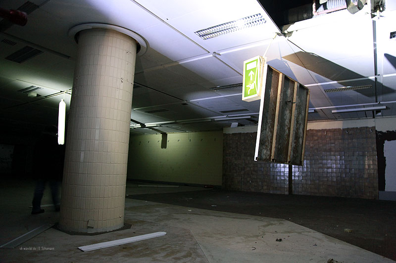 Der Kaufhof schloss 1999 für immer seine Pforten. Jetzt wird er abgerissen. Kurz vorher gab es die Gelegenheit, noch einmal offiziell hinein zu sehen. Der Einstieg (über eine zur Treppe umfunktionierte Leiter) erfolgte durch den Hintereingang und ein Wandloch. Dann standen wir im Erdgeschoß. Durch den zugeklebten Haupteingang fiel ein wenig Licht. Insgesamt war der große Raum viel kleiner, als in meiner Erinnerung – die Gänge und Waren zur Gliederung fehlen. Gespenstisch… der Weg ins UG über die Treppen – die Rolltreppen könnten einstürzen – die gläsernen Geländer geborsten auf den Stufen.