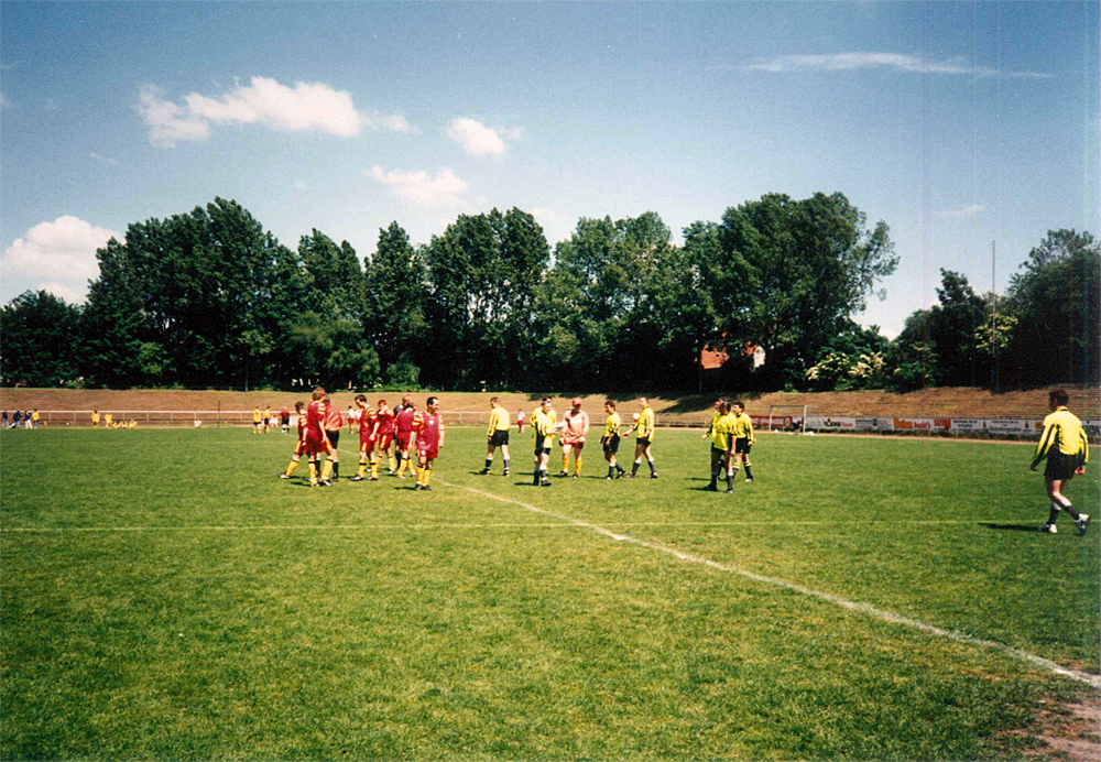 Angekommen machte sich jeder, der (glaube) noch laufen zu können machte sich fertig für das Spiel: Wie die Profis sahen sie aus, die Vertreter des Kaufhof Völklingen. Der Rest unserer munteren Truppe bildete den Fanclub. Wir feuerten unsere Kämpfer laut stark an!