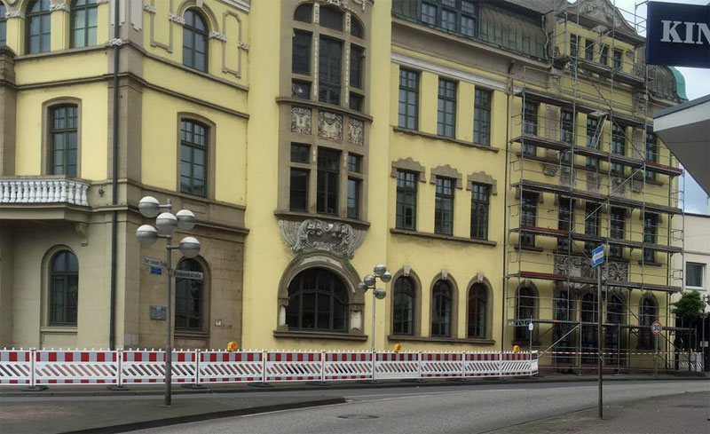 Dies geschieht in enger Abstimmung mit dem Landesamt für Denkmalpflege. Dabei wird ein Katalog erstellt für eine anstehende Fassadensanierung. Für die Arbeiten wurden Barrieren rund um das Gebäude errichtet. In der 27. KW werden nach der Untersuchung die Barrieren entfernt. (PM Stadt VKL)