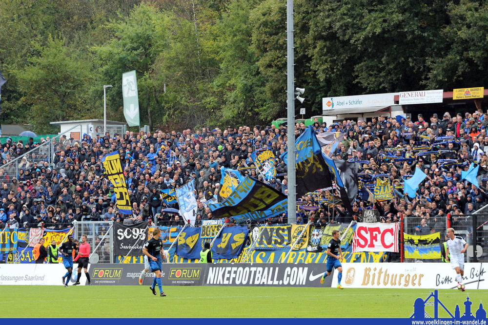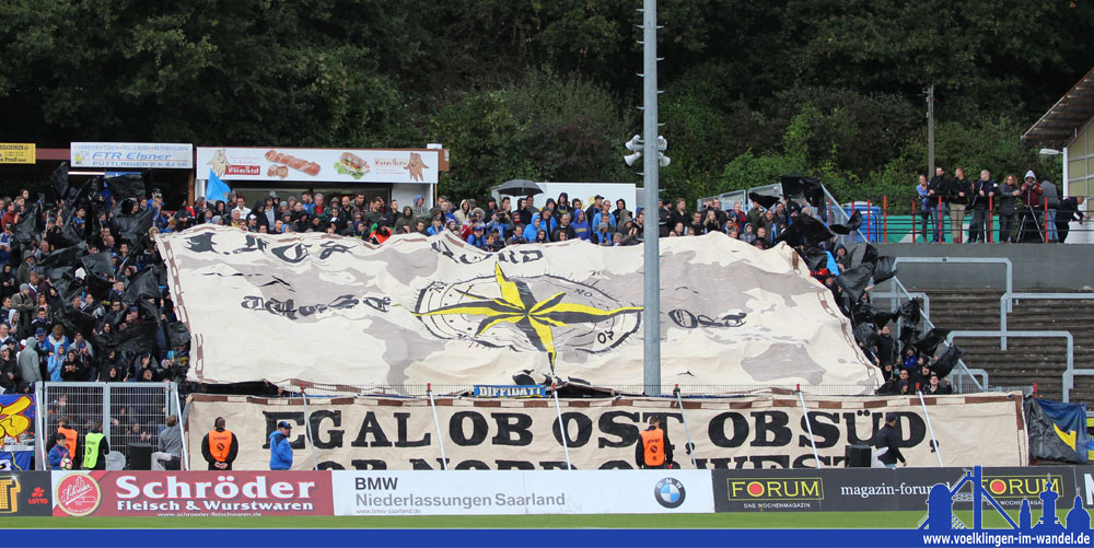Neben dem Platz ging es ruhiger zu als zuletzt. Die Polizei hatte die Fanmenge stehts unter Kontrolle, das größte Ärgernis sind die Verkehrsbehinderungen in der Völklinger Innenstadt, ausgelößt durch die Fußgruppe der Gästefans zwischen Bahnhof und Hermann-Neuberger-Stadion. Außer dem üblichen Schmähgesang und ähnlichen verbalen „Nettigkeiten“ blieb es friedlich.