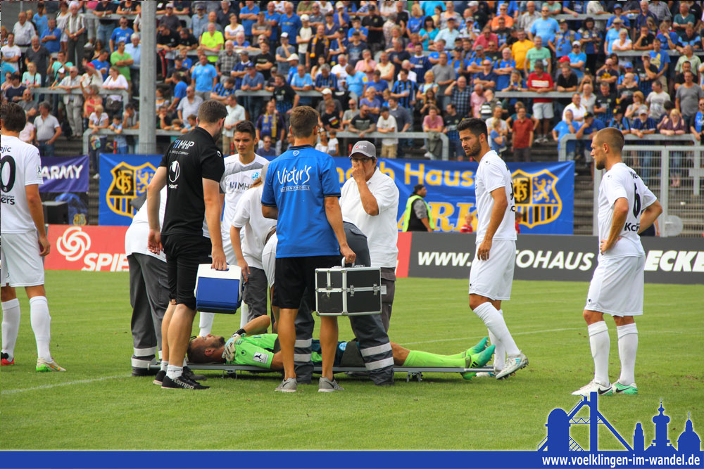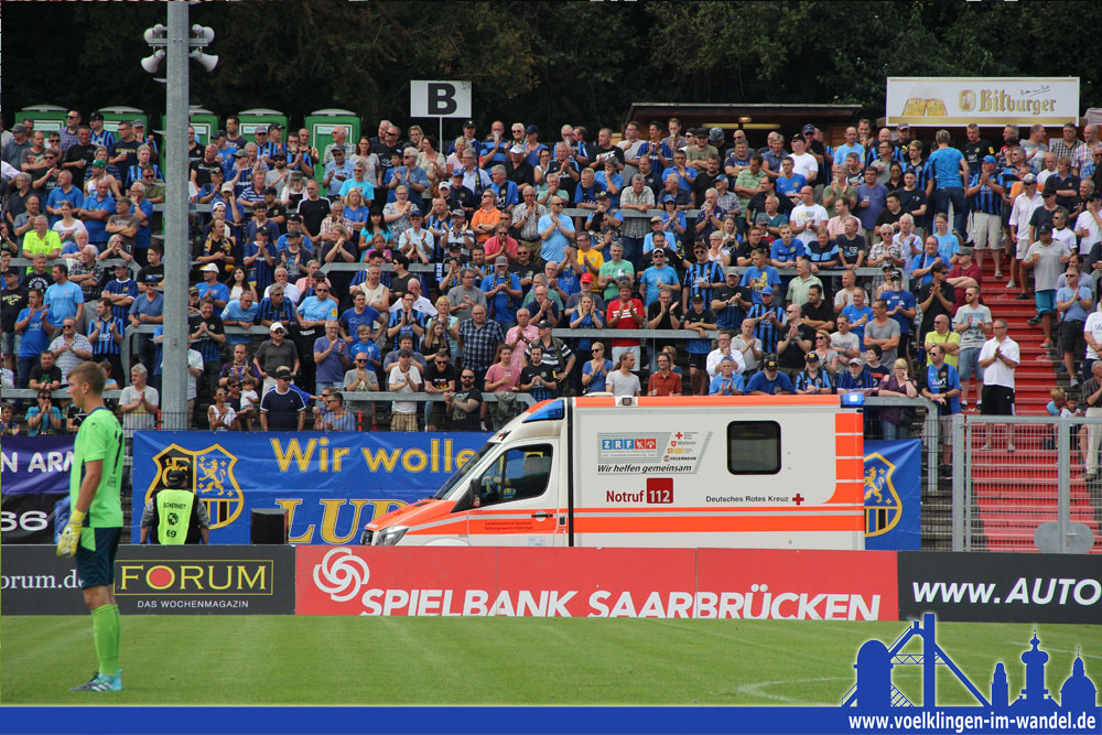 Nicht nur der Saarbrücker Mannschaftsarzt half in der Not, auch das Publikum zeigte sich in Völklingen von seiner besten Seite: Es verabschiedete den verletzten Keeper mit großem Applaus, als er an den Rängen vorbei im Krankenwagen abtransportiert wurde.