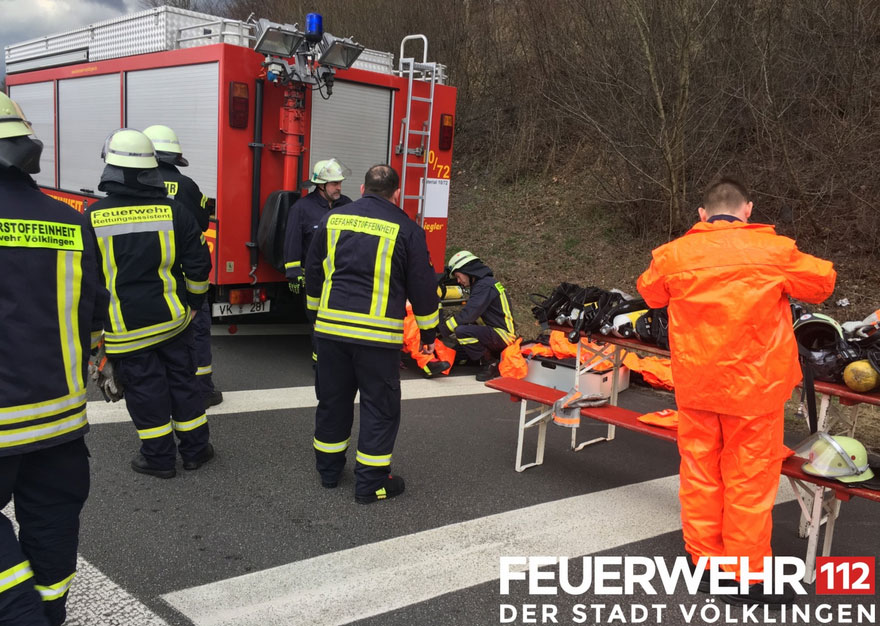 Zum Sichern und Umpumpen der Beladung wurde der Gefahrgutzug des Regionalverbands Saarbrücken alarmiert. ur Einsatzstelle verbracht, da das neue Trägerfahrzeug bisher noch nicht ausgeliefert wurde. Neben den Kräften der Polizei waren somit die Freiwilligen Feuerwehren von Bildstock, Friedrichsthal und Völklingen mit circa 60 Einsatzkräften und 10 Fahrzeugen vor Ort. Auch die Feuerwehrm Püttlingen war am Unfallort, die seit kurzem in Püttlingen vorgehaltenen Gerätschaften des Gefahrgutzugs wurden mit dem MTF zur Unfallstelle verbracht, da das neue Trägerfahrzeug der Feuerwehr bisher noch nicht ausgeliefert wurde.