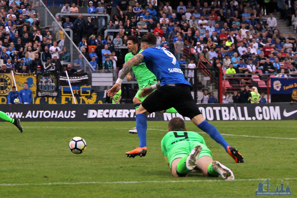 Schockstarre bevor das Spiel richtig los ging! Nach einem Eckball stocherten die Münchner den Ball irgendwie ins Netz der Hausherren, Münchens Toptorjäher Sascha Mölders machte seinem Ruf alle ehre! 0:1 nach 45 Sekunden – Schockstarre im Hermann-Neuberger-Stadion bei allen Blauschwarzen. Doch dann ging es direkt zur Sache: Vor 6800 Zuschauern im ausverkauften Völklinger Stadion warfen nun beide Teams alles auf Angriff. Der FCS wollte den Rückstand wieder wett machen, 1860 ein Polster für das Rückspiel aufbauen. Hochkarätige Chancen gab es auf beiden Seiten.