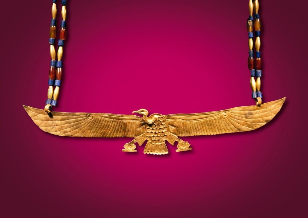 Mehrere der im Weltkulturerbe Völklinger Hütte ausgestellten Goldschmiede-Arbeiten zählen zu den besten ihrer Art. Der Halskragen aus Hez-Vasen, Gold- und Fayenceperlen aus der Zeit um 1550 v. Chr. gehört zu den feinsten bekannten Beispielen von Feingliedrigkeit und Detailarbeit ägyptischer Goldschmiedekunst. Mehrere Jahre war dieser Halskragen im Metropolitan Museum of Art, New York, zu sehen. Andere Meisterwerke altägyptischer Goldschmiedekunst, die aufgrund ihrer filigranen Machart mit Sicherheit königlichem Goldschmuck zuzuordnen sind, werden im Weltkulturerbe Völklinger Hütte zum ersten Mal öffentlich gezeigt. Seit der frühesten dynastischen Zeit um 3000 v. Chr. wird die Hieroglyphe “Gold“ durch einen Perlenhalskragen dargestellt, dem von Pharaonen, königlicher Familie und später auch Privatpersonen am häufigsten getragene Schmuck.