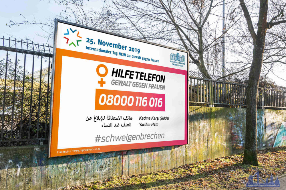 Das Frauenbüro des Regionalverbands Saarbrücken weist aufgrund der derzeitigen Lage mit einer Plakataktion und auf der Internet-Seite auf Hilfsangebote bei häuslicher Gewalt hin. Auf insgesamt zwanzig Großflächenplakaten wird in den Regionalverbands-Kommunen auf die Kontaktdaten des Hilfetelefons „Gewalt gegen Frauen“ aufmerksam gemacht. Von den Plakaten befinden sich ab Ende der Woche zehn in Saarbrücken selbst und zehn in den Umlands-Kommunen. Unter der Telefonnummer 08000 116 016 können Betroffene oder Personen aus deren sozialen Umfeld täglich und rund um die Uhr eine Beraterin erreichen. Auf Wunsch können beispielsweise auch Unterstützungsmöglichkeiten und Hilfsangebote in der Nähe vermittelt werden. Der Anruf ist kostenfrei. Auf den Großflächenplakaten wird zudem in deutscher, türkischer und arabischer Sprache dazu ermuntert, das Schweigen zu brechen.