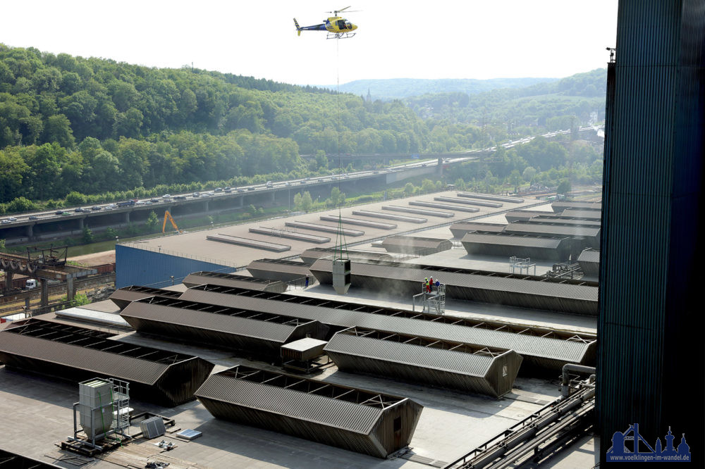 #Völklingen. Gestern wurden insgesamt 3 neue Schalldämpfer im Dachbereich der Stranggießanlage S1 und S2 des Stahlwerks von Saarstahl erfolgreich und sicher montiert Die Bauteile wurden hierfür mittels 30 Meter langem Transportseil an einen Hubschrauber angeschlagen und anschließend unmittelbar auf dem Stahlwerksdach abgesetzt und befestigt.