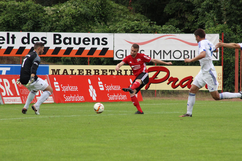 Minute 34: Zimmermann spielt bei einem Freistoß den Ball auf Zimmer, der köpft das Tor des Tages des Saarländischen Rundfunks: 1:1! Das Spiel ist wieder offen. Röchling macht weiter Druck. Nur zwei Minuten nach dem Ausgleich wird das belohnt: Ein Schuss wird abgefälscht, der Gästetorwart ziemlich Chancenlos, der Gastgeber führt mit 2:1. Nach diesem Spielverlauf verdient.
