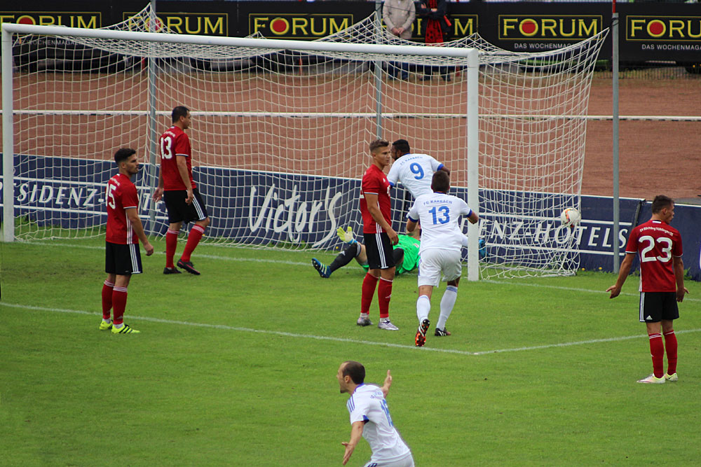 „Wir sahen wenig Fußball, viele Zweikämpfe. Ein Spiel mit vielen Nicklichkeiten.“, resümiert Günter Erhardt, Trainer des SV Röchling Völklingen nach dem Spiel. Die Gäste kamen besser in die Partie, die Gastgeber allerdings die erste kleine Chance. Doch diese blieb ungenutzt. Anders auf der anderen Seite in der 14. Minute: Karbach kommt aus dem Nichts zum Angriff, Osacr Feilberg erst mit dem Kopf, Völklingens Torwart Sebastian Buhl kann abwehren und gibt damit Karbacher Stürmer die Vorlage: Er schlenzt den Ball mit dem Knie über den Torwart hinweg ins Tor. 0:1 für die Gäste.