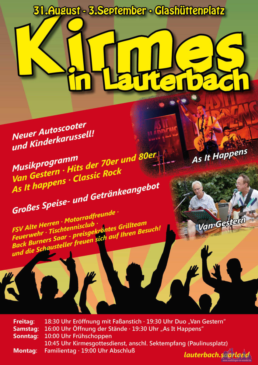 #Lauterbach. Am Freitag, 31.August wird mit einem Fassanstich die Lauterbacher Kirmes auf dem Glashüttenplatz in der Köhlerstraße eröffnet. Für die musikalische Unterhaltung sorgt danach das Duo „Van Gestern“ mit Hits der 70er und 80er Jahre.