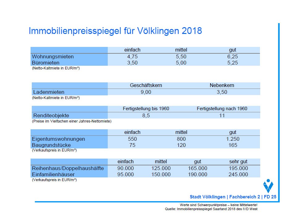 Der Immobilienpreisspiegel ist auf der Internetseite der Stadt Völklingen unter nachfolgendem Link abrufbar: http://www.voelklingen.de/index.php?id=1812