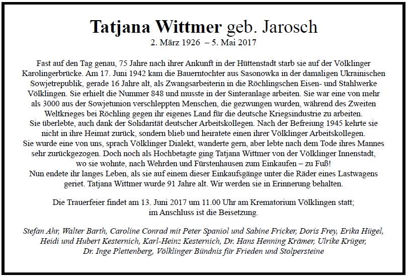 Ihr richtiger Name ist Tatjana Jarosch, verheiratete Wittmer. Fast auf den Tag genau, 75 Jahre nach Ihrer Ankunft in Völklingen, starb nun Tatjana Wittmer auf der Völklinger Karolingenbrücke, tot gefahren von einem LKW, der aus dem Werk kam, in dem sie damals auch als Sklave gefoltert wurde. Uns hat dieses schwere Schicksal dieser Frau sehr bewegt. Auch eine kleine Anzahl anständiger Völklinger Bürger hat Tatjana Wittmer in einem würdigen Nachruf im Wochenspiegel gedacht.