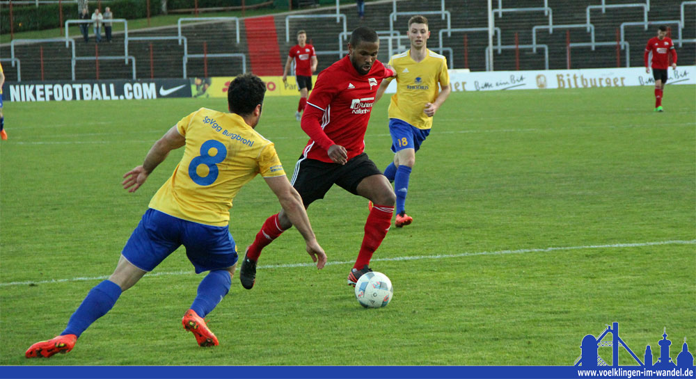 Der heutige Respekt gehörte von Beginn an den Gästen aus Burgbrohl! Wer etwa 400 Kilometer für ein Spiel, das auch noch unter der Woche stattfindet, als Schüler, Student oder eben einfach berufstätiger Hobbykicker aus der C-Klasse, mit dem Wissen so gut wie garantiert vom Platz geschossen zu werden auf sich nimmt, der verdient wohl größeren Respekt als so manch Serienmeister! So jubeln auch die Kicker des SV Röchling Völklingen schon beim 1:0 durch Samir Louadj in der 8. Minute nur verhalten, beim 2:0 durch Marvin Wollbold nur drei Zeigerumläufe später gibt es bereits nur noch den klassischen „Handshake“ – auch auf dem Platz ist allen Völklinger Spielern bewusst, wie belastend die Situation für die Männer aus Burgbrohl sein muss. Eine Situation, welche die Gäste bei anderen Mannschaften nicht immer vorfanden: Von bereits erlebten Beleidigungen und wüsten Beschimpfungen ist in Völklingen keine Spur – einige Völklinger Fans feuerten die Gäste bei ihren wenigen Ausflüchten nach vorn sogar regelrecht und wirklich ernstgemeint an.