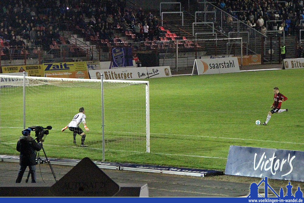 Günther Erhardt wechselte in der Pause gleich doppelt, Gianluca Lo Scrudato und Luka Dimitrijevic kamen für Jannik Messner und Lars Birster in die Partie. Was dem FCS fehlte, war das zweite Tor, so blieb das Spiel durch eine gut sortierte Völklinger Abwehr und schnelle Konter offen. Die größte Saarbrücker Chance vergab Mendler: Schön freigespielt traf er aus kurzer Entfernung nur den Querbalken. Auf der anderen Seite dann ein Standard für Völklinger, Zimmer stieg im Strafraum hoch und es stand 1:1!