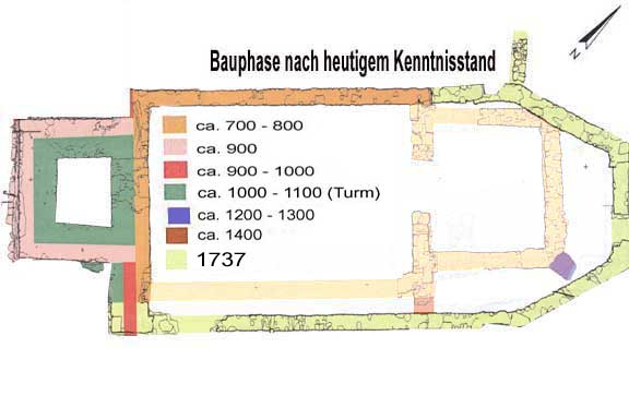 Das Schiff wurde wieder hergestellt wobei die Südwand weiter herausgerückt und der Chor durch einen neuen dreiseitigen Schluss nach Osten verlängert wurde (XLIV.).