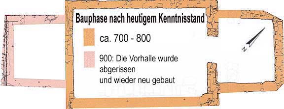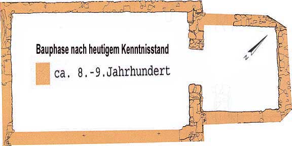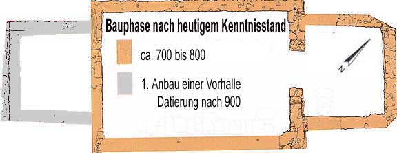 Die älteste zu diesen Vorbauten gehörende Mauer wurde in einen zur Zeit ihrer Errichtung bereits bestehenden Friedhof gesetzt. Sie durchschnitt eine ältere Bestattung und wurde wiederum teilweise durch eine jüngere überlagert. Eine naturwissenschaftliche Datierung des Todeszeitpunktes der beiden Bestatteten ergab für das ältere Skelett einen Mittelwert von 996 n. Chr., für das jüngere einen von 1024 n. Chr., jeweils mit einer Schwankungsbreite von ca. +/- 30 Jahren. Durch diese beiden Gräber wird sowohl die Anlage als auch der teilweise Abriss des älteren Anbaues in die Zeit um die Wende des 1. Jahrtausends n. Chr. datiert. Da diese und benachbarte Bestattungen abweichend zu der im Mittelalter üblichen christlichen WO- Orientierung (Kopf im Westen, Füße im Osten) SW-NO-orientiert waren, ist davon auszugehen, dass das Gräberfeld sich auf den Kirchenbau bezieht, der eine identische Abweichung der Ausrichtung aufweist. Somit reicht die erste nachgewiesene Kirche mindestens bis in das 10. Jh. zurück. Ob sie tatsächlich bereits zur Zeit Ludwigs des Frommen bestand, ist zwar nicht eindeutig zu belegen, doch einige im Friedhofsbereich verlagerte Fundstücke, darunter ein in die Zeit von Ludwigs Nachfolger Karls des Kahlen datierender Riemenbeschlag, aber auch einige Scherben und Riemenzungen, die nur allgemein dem 8./9. Jahrhundert zugesprochen werden können, beweisen zumindest eine Nutzung des Ortes in der Karolingerzeit. Da man Kirchen in der Regel immer wieder an derselben Stelle errichtete, ist zu vermuten, dass es sich bei der ältesten ergrabenen Bauphase um die karolingerzeitliche Kirche handelt. Ein Vorgängerbau aus Holz ist zwar nicht auszuschließen, doch wegen der vor Ort verfügbaren bereits behauenen Steine nicht wahrscheinlich.