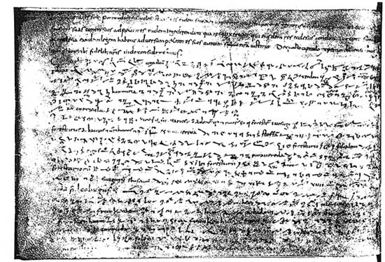 Der Schreiber der Fulcolingas-Urkunde bediente sich einer Schnellschrift. Die Schriftzeichen werden als so genannte „Tironische Noten“ bezeichnet, benannt nach Publius Tiro, einem Freigelassenen des großen Römers Marcus Tullius Cicero (gestorben 43 vor Christus). Leute, die diese schwierigen „Noten“ schreiben konnten, hießen „Notare“.