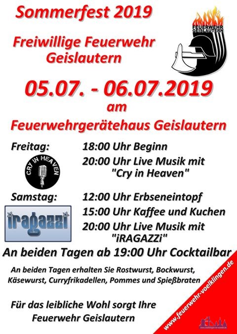 #Geislautern. Am Freitag, 05.07.2019 ab 18:00 Uhr und am Samstag, 06.07.2019 ab 10:00 Uhr findet um das Gerätehaus Im Kirchenfeld das diesjährige Sommerfest der Freiwilligen Feuerwehr Völklingen, Löschbezirk Geislautern, statt.