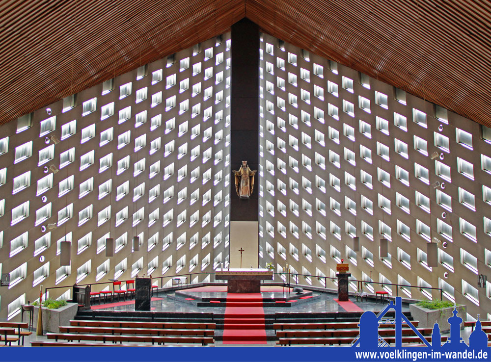 Erstellung eines Neubaus, Architekt ist Konny Schmitz (Dillingen) mit einem mathematisch kalkulierten Lichtspiel im Inneren: Der halb im Boden versunkene Saalbau wurde über einem rautenförmigen Grundriss errichtet. Die tragenden Wände sind aus schrägen Lagen von alternierend versetzten Betonformsteinen gestapelt. Ein gleichmäßiges Raster aus kleinen Fenstern mit matten Glasscheiben schließt die Zwischenräume. Das Lichtspiel im Innenraum wird durch die zweischalige Fassade umgelenkt und durchleuchtet den Altarraum mit indirektem Licht. Ein hoher Ringanker umläuft das Gebäude an der Traufe zum schrägen Zeltdach. Den höchsten Punkt des Kupferdaches bildet die hintere Ecke des Chores, etwas niedriger ist die gegenüberliegende Gebäudeecke. Die beiden Ecken im Norden und Süden sind noch tiefer gezogen. Man betritt die Kirche über einen kleinen kubisch auskragendes Portal mit Kupferverkleidung. Die Decke ist mit Holz verkleidet. Der Marmoraltar steht auf einem breiten Podest mit Stufen zum Kirchenraum. (Wikipedia)