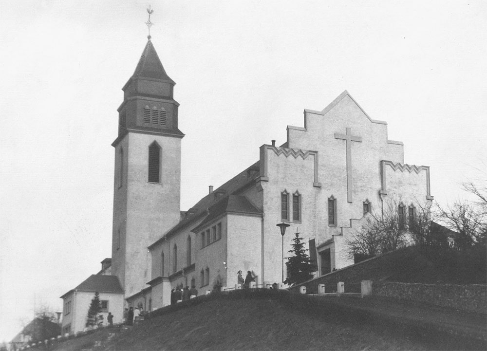 Fertigstellung der nach Entwürfen von Architekt Becker-Falkowski gebauten Kirche, nur der Turm fehlte noch.