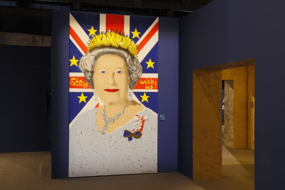 #Völklingen. „Stay with us!“ – Das neue Werk des Bananensprayers Thomas Baumgärtel ist nun in der Ausstellung „Legende Queen Elizabeth II. Sammlung Luciano Pelizzari“ im Weltkulturerbe Völklinger Hütte zu sehen. Das Kunstwerk mit den Maßen 317 x 178 cm weckt Assoziationen zur aktuellen Brexit-Debatte. Es zeigt Queen Elizabeth II. im Stil der Pop Art. Im Hintergrund verbinden sich die britische Union Flag und die Sterne der Europaflagge. Vor diesem Hintergrund liest man den Appell Bleibe bei uns – „Stay with us!“. Als Krone fungieren die für Thomas Baumgärtel typischen Kunst-Bananen. Die Banane ist das künstlerische Erkennungszeichen von Thomas Baumgärtel. Das Werk „Stay with us!“ von Thomas Baumgärtel bildet nun den Abschluss der Ausstellung „Legende Queen Elizabeth II. Sammlung Luciano Pelizzari“ im Weltkulturerbe Völklinger Hütte. Die Ausstellung ist noch bis Ostermontag, den 22. April 2019, im Weltkulturerbe Völklinger Hütte zu sehen.