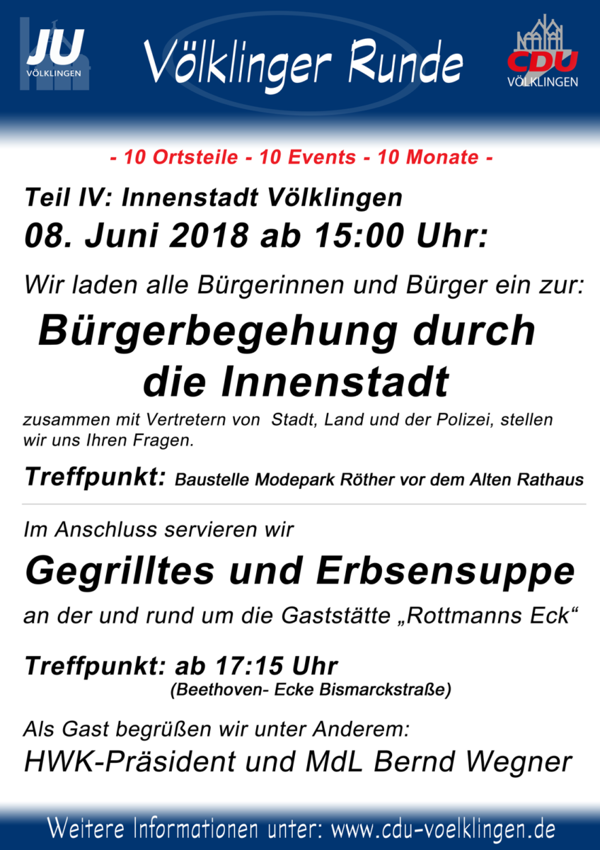 In der vierten Runde lädt die Junge Union Völklingen gemeinsam mit dem CDU-Ortverband Völklingen-Mitte alle interessierten Bürgerinnen und Bürger zur gemeinsamen Bürgerbegehung der Innenstadt ein.