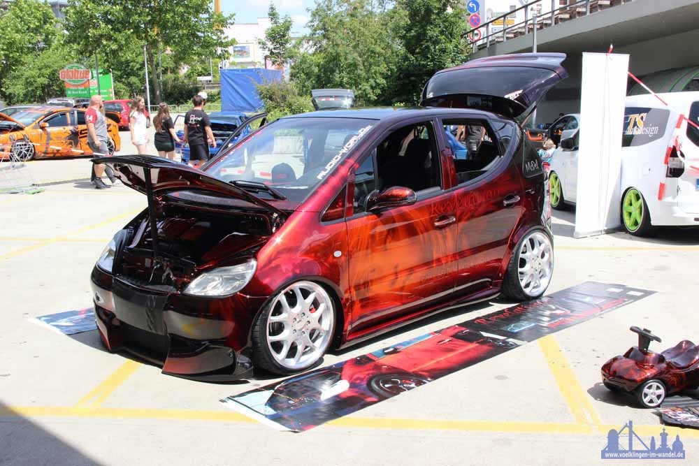 Rund 300 Parkplätze kann das neue Parkhaus des Völklinger SB-Warenhauses vorweisen. „So gut wie voll!“, meldet das Veranstaltungsteam von Globus schon gegen 12 Uhr, was durch großzügige Einweiser – der Tuner parkt bekanntlich schräg! – alleine dort auf rund 250 Autos schließen lässt. Hinzu kommt der VIP-Bereich auf dem alten Parkhausdeck, so dass man sich über gut 350 bis 400 Fahrzeuge freuen durfte. Über 300 Kilometer kam ein Autobegeisterter angereist, ergatterte so den Pokal für die weiteste Anreise – das andere „Extrem“ hat sein Fahrzeug auf der anderen Straßenseite gemeldet – der „Localhero“ hatte es also keine 10 Meter als schon gegen 10:30 Uhr die Autos auf der Straße am Hüttenwerk Schlange standen um einen der begehrten Plätze auf dem Gelände zu bekommen.