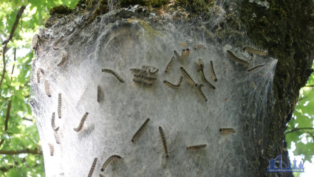 Bedingt durch die überdurchschnittlich warmen Monate Mai und Juni hat sich der Eichenprozessionsspinner im Stadtgebiet stark ausgebreitet. Viele Eichen in den Grünanlagen, im Wald, aber auch auf Privatgrundstücken sind zurzeit befallen.