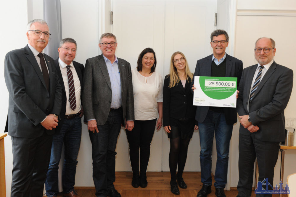 #Regionalverband. Für die Machbarkeitsstudie „Inszenierung von Landmarken im Warndt“ hat der Staatssekretär für Umwelt und Verbraucherschutz, Roland Krämer, dem Regionalverbandsdirektor Peter Gillo einen Scheck in Höhe von 25.500 Euro überreicht. Vier Landmarken im Warndt, der Schweizerberg in Völklingen, die Bergehalde Velsen, der Förderturm St. Charles in Großrosseln und der Parc Explor Wendel in Petite-Rosselle, sollen über die Grenze hinweg vernetzt und zu besonderen Erlebnisorten ausgebaut werden. Dabei will der Regionalverband Saarbrücken unter anderem innovative Beleuchtungskonzepte zur Kommunikation zwischen den Landmarken entwickeln. Den Bürgern soll dabei eine aktive Teilnahme ermöglicht werden.