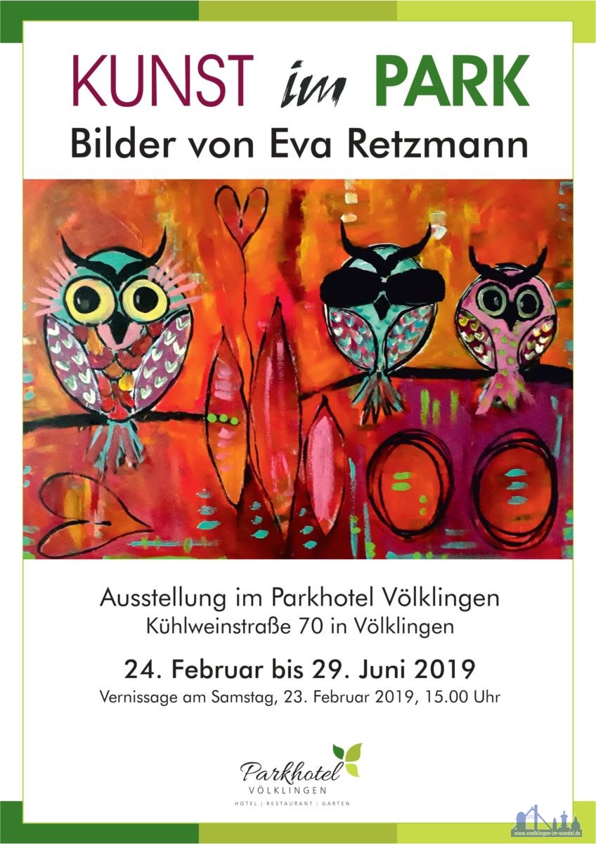 Die Laudatio hält Manfred Pfeiffer. Die Vernissage wird musikalisch umrahmt von dem Gitarristen Dirk Mohr. Die Ausstellung kann bis zum 29. Juni 2019 während der Öffnungszeiten des Parkhotels in der Kühlweinstraße 70 in Völklingen besucht werden. Der Eintritt ist frei. PM E. Retzmann