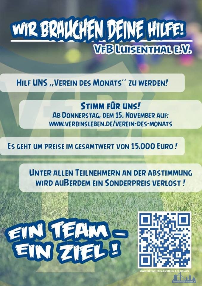 #Luisenthal. Der VfB Luisenthal ist ein Traditionsverein der Jahrzehnte lang eine gute Jugendabteilung hatte, und mit dieser auch mit Erfolg und Meistertitel errungen hat. In den letzten Jahren konnte der Verein allerdings leider keine Jugend mehr unterstützten. Das soll sich nun wieder Ändern: Als Verein des Monats könnte der VfB dabei hilfreiche Utensilien gewinnen, oder aber 10.000 Euro für die Vereinskasse. Sie können den Verein dabei online unterstützen!