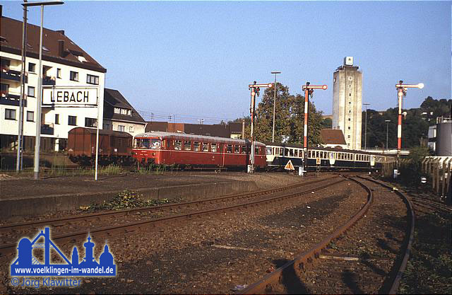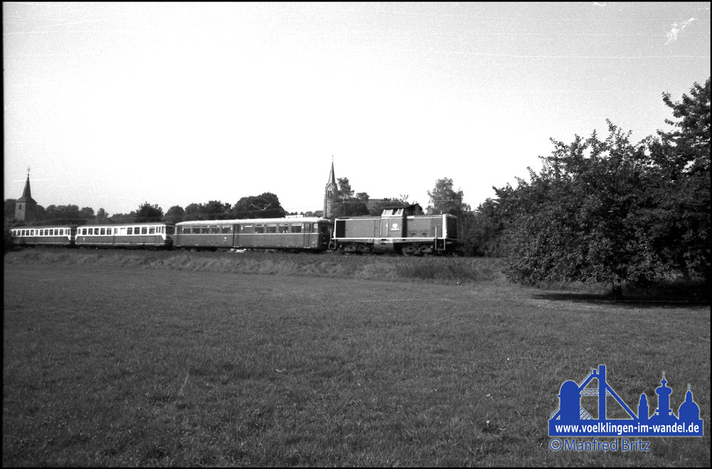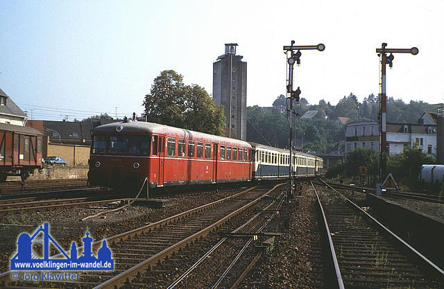 Hier steht der Sonderzug mit 2x 515 und 2x 815 des Bw Worms abfahrbereit auf Gleis 5 vor der imposanten Kulisse der ebenfalls um diese Zeit stillgelegten Völklinger Hütte.