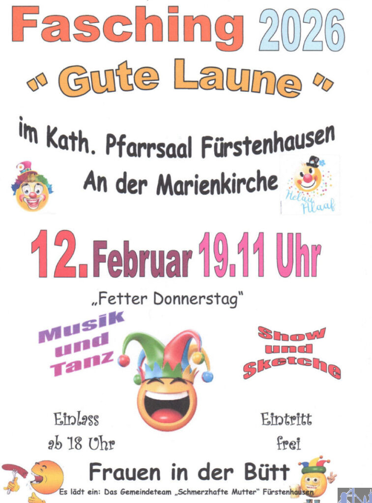 Mit diesem Motto lädt das Gemeindeteam „Schmerzhafte Mutter“ Fürstenhausen herzlich zu einem fröhlichen Faschingsabend ein.