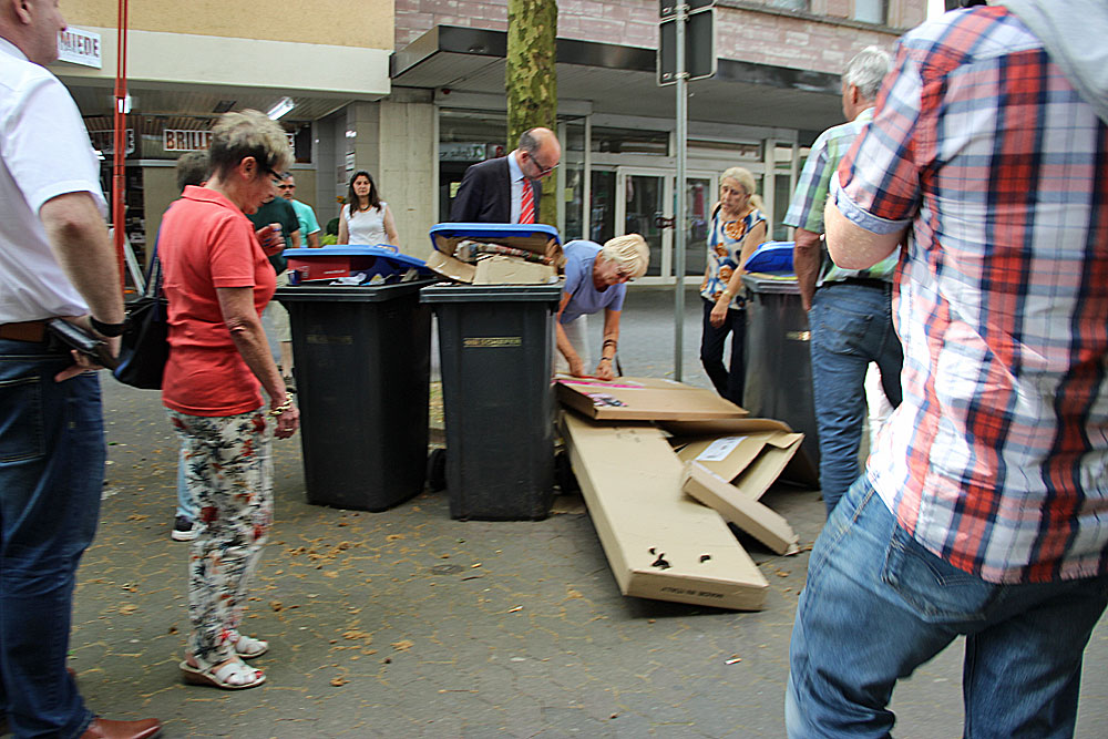 Nach ein paar Schritten in Richtung Innenstadt findet sich in mitten der Poststraße eine Ansammlung überfüllter blauer Tonnen, Kartonagen verziert mit einem Hundehaufen: „Was für eine Sauerei!“, stellt Christine Olbert trocken fest, gleich gehen einige Rundgangteilnehmer dem Übeltäter auf den Grund: Ein Geschäft, das einen Tag später (Beobachtung des Autors) inmitten dieser Umgebung ein Werbeschild plaziert. Ein wütender Begleiter des Rundgangs stellt trocken fest: „Und morgen meckern die dann noch über die dreckige Stadt.“