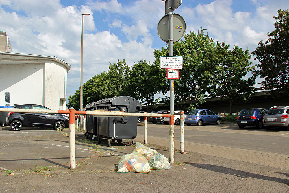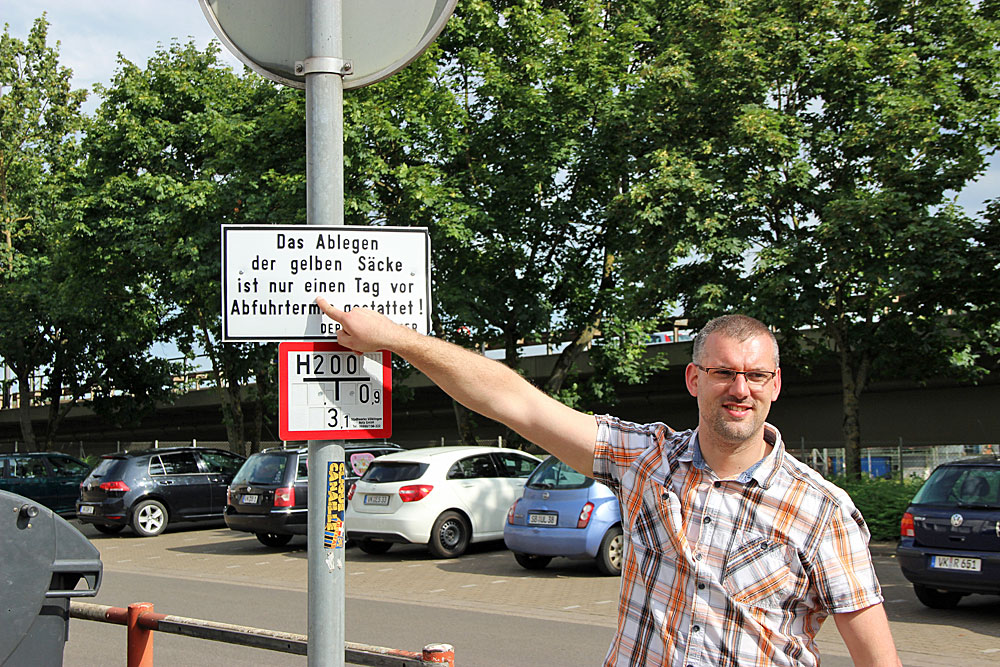 In der Straße am Hauptbahnhof angekommen wieder ein Ärgernis: 8 Tage bevor die Abfuhr der gelben Säcke ansteht liegen dort darüberhinaus falsch befüllte Entsorgungsbeutel: „Dabei ist klar geregelt, wie was entsorgt werden soll, was wann vor die Tür gestellt wird.“, stellt Karsten Vitz fest, dessen Fraktionskollege Kevin Frank auf das passende Schild deutet, es ist genau über der Müllablagerung angebracht und weist nochmals auf die Regelung hin: „Das Ablegen der gelben Säcke ist einen Tag vor Abfuhrtermin gestattet.“, macht das Schild, wohl vom Ordnungsamt, klar. „Ordnungsamt“, ein Stichwort auf das wütende Bürger gewartet haben: „Machen die nichts? Die kümmern sich doch gar nicht! Heute war auch keiner auf der Straße zu sehen!“, wirft ein Herr ein, eine Frau vermutet: „Mir hann noh Fünf, die hann Feierowend!“. Viele Vorwürfe gegen das Ordnungsamt, dessen Amtsleiter Herbert Mailänder der für den Kommunalen Ordnungsdienst (KOD) zuständig ist, sich wegen Fernbleiben nicht äußern konnte. Dabei hätte er dabei sein sollen, wie der gerade von einem anderen Termin zurück geeilte Oberbürgermeister Klaus Lorig seinen Parteikollegen später beim Abschlusstermin berichtet. Das könnte Ärger geben!
